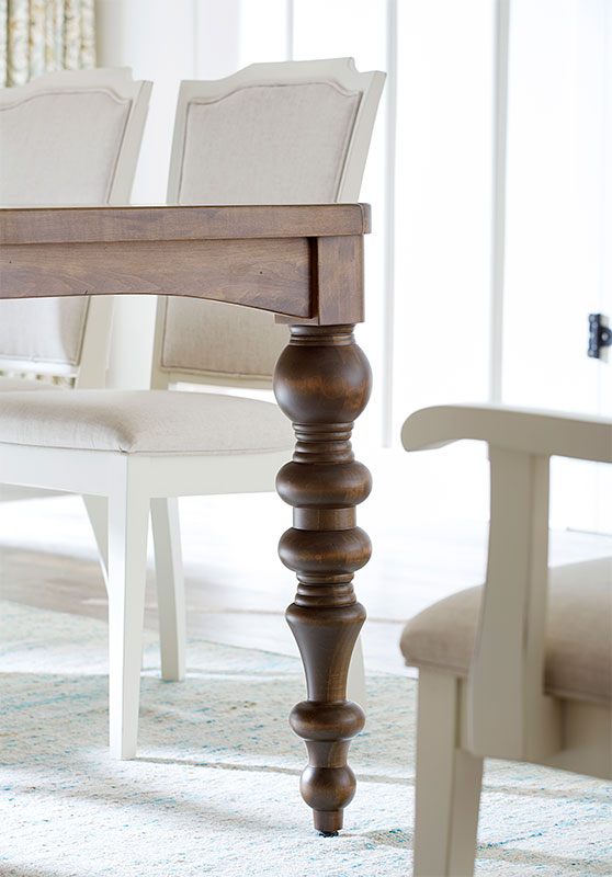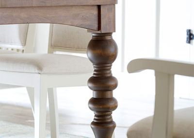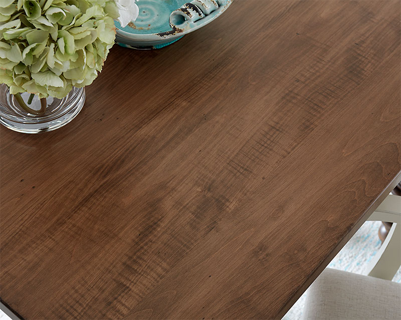 All stains are hand sprayed to assure complete coverage. The stain is then hand rubbed, which results in an even and consistent color while enhancing the beauty of your table's unique grain. After a drying period, each table is given a coat of sealer, then hand-sanded. This process reduces any raised grain that may have resulted from the sealing process. Finally, a finish coat is applied, providing an even luster that will provide years of durable beauty for your table.